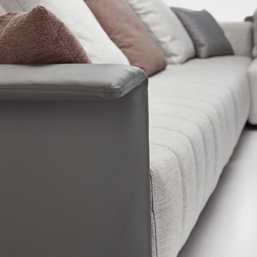 扶手以皮革飾面,巧妙扭結設計剪裁,