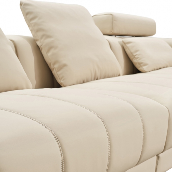 沙發底部崁入科技燈帶,結合科技的便利性,柔和的光線,不僅營造出溫馨的氛圍,更突顯獨有的現代感與獨特品味。無論是夜晚的靜謐時光,還是閱讀時的沉浸氛圍,讓科技點亮生活,享受每一刻的詩意時光。