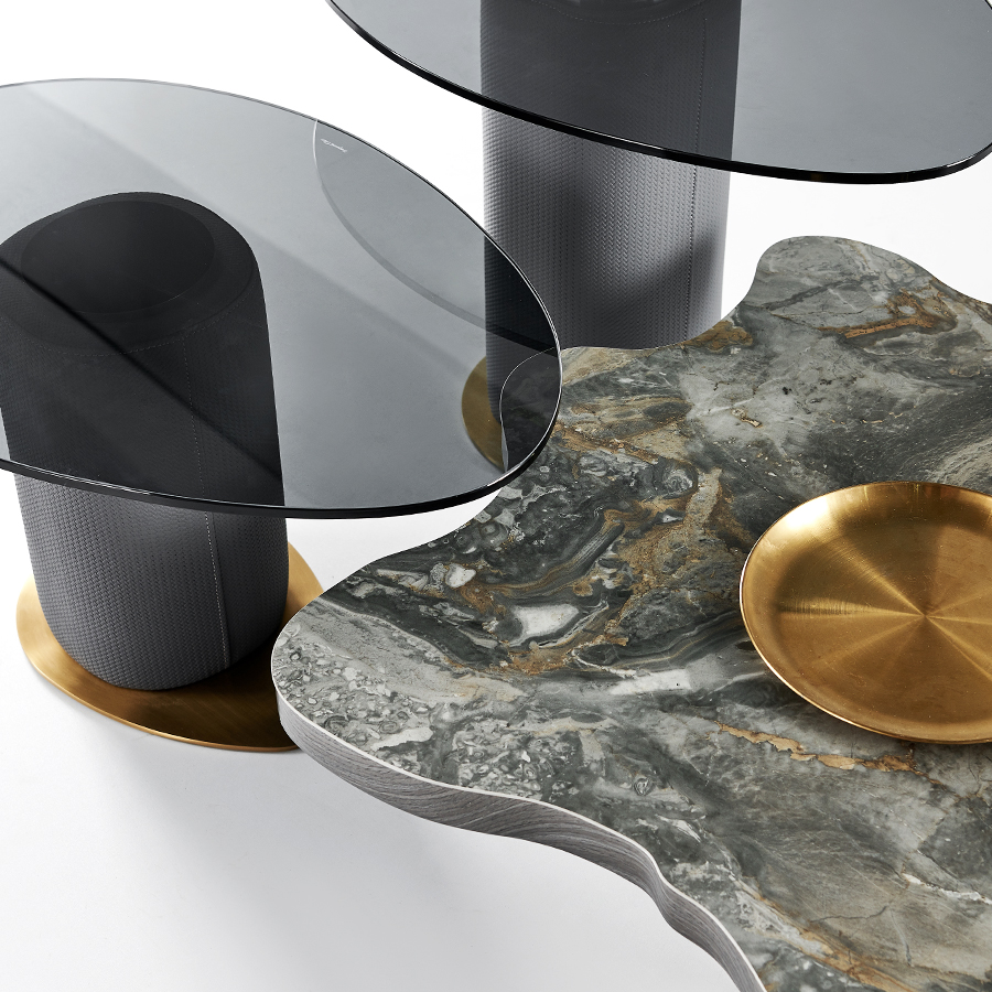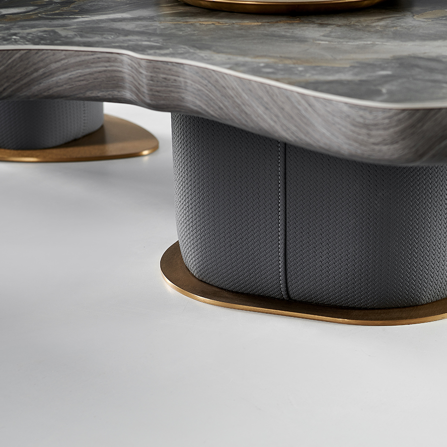 非凡的岩板紋理,蜿蜒曲折的線條與直木紋的包邊設計,細節體現美感,底座由皮革封閉,