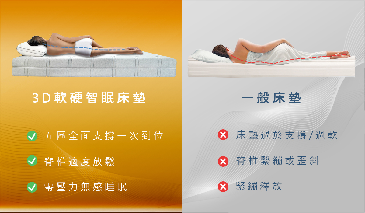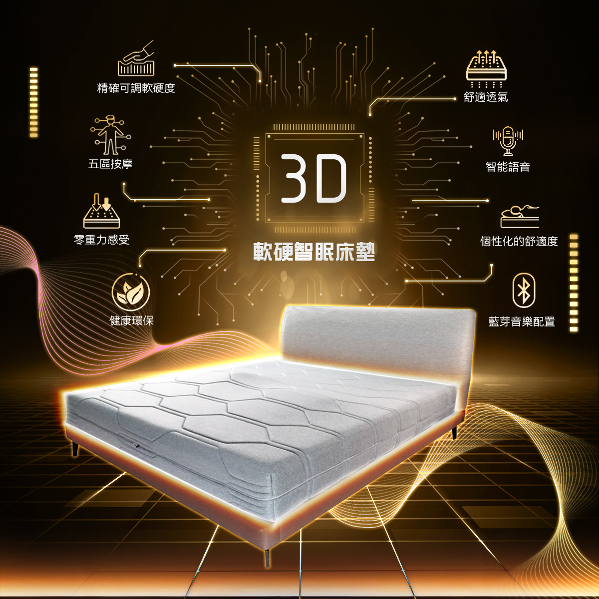 傳統床墊通常使用單一材料,如泡棉、彈簧,這些廣泛被使用的材料難以適應不同體型和睡姿的需求,這導致很多人在使用傳統床墊時感到不適應,甚至影響睡眠品質,3D軟硬智眠床墊通過採用先進的材料和設計,打破傳統床墊的局限性,使得床墊能夠更靈活地適應個體差異,提供更個性化的睡眠體驗,打開睡眠新時代的大門,不僅在於它是一張床,也是個性化、智能科技的象徵,全方位舒適度,更強化使用者對睡眠品質與舒適度的不斷提升的需求,將夜晚轉變為真正的休息和身體恢復時光。