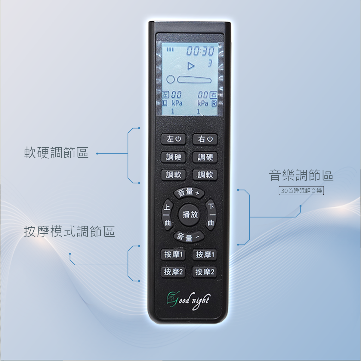 遙控器採用三區設計,輕鬆實現軟硬調節、睡眠音樂控制以及模式切換功能。