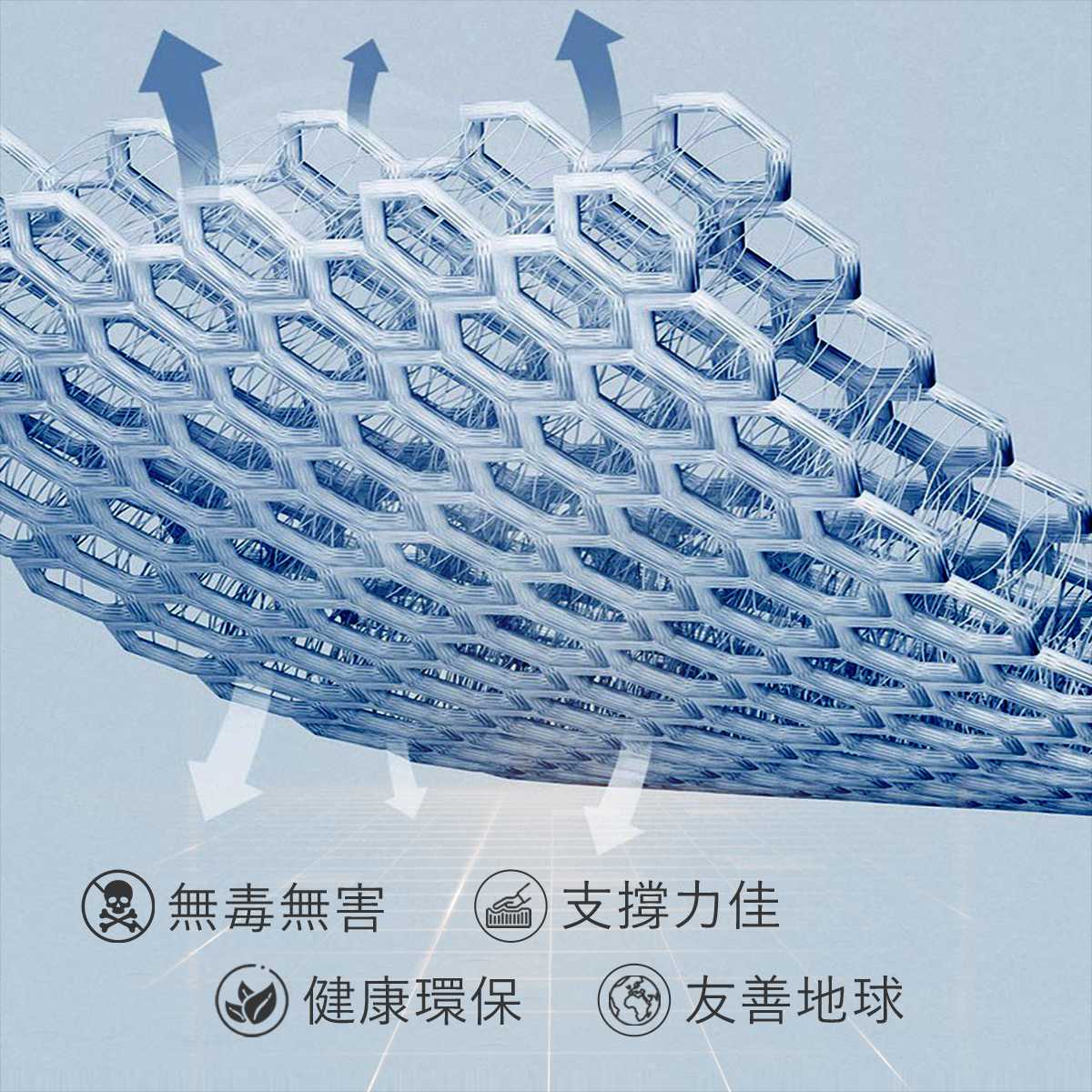 全新的環保材料──3D高分子泡棉,以其分子透氣結構確保清爽舒適的睡眠環境,