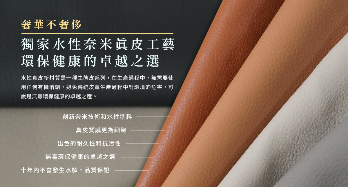 水性奈米真皮擁有真皮的觸感,細膩整齊的紋路,耐磨、耐刮、極強的防水材質,不含甲醛、重金屬等有害成分,確保居家健康安全。透過創新技術,水性奈米真皮不僅延長皮革的使用壽命,更能滿足喜愛真皮觸感的消費者需求。尤其適合家中有養寵物的朋友或是有學齡前的孩童,這種材質的家具商品在耐用性、觸感舒適度以及環保特性方面都表現卓越。水性真皮/牛皮無疑是未來家具市場中的新時尚,提供一個健康、環保且高品質的選擇。