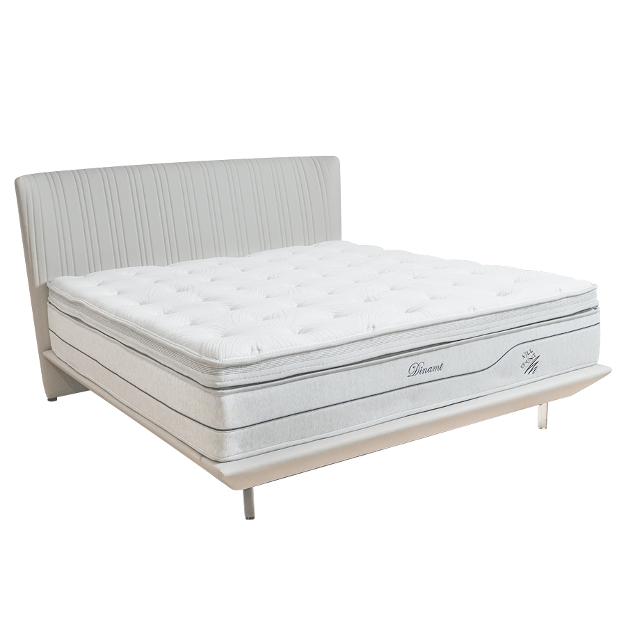 水晶圓柱腳設計,瞬間提升整體設計的時尚感,並賦予其夢幻般的質感。圓潤的水晶腳彷彿漂浮於空中,帶來輕盈的視覺效果。這一獨特細節,同時強化了結構的穩固性,提升臥室優雅與現代的氛圍,成為空間中的精緻亮點。