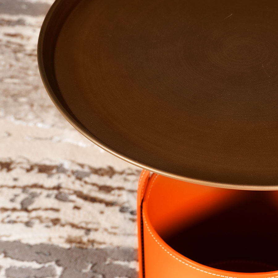 這款優雅的邊几,優美曲線支撐啞光金色噴漆鋼檯面,並配有愛馬仕橘底座,現代及經典的奢華感。